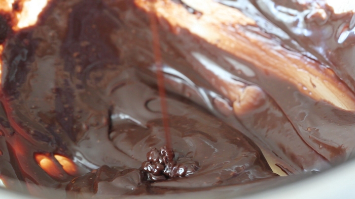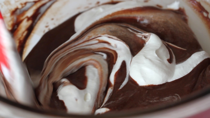 • 2. Now whip ½ cup of whipping cream without sugar until thick. And pour 1/3 of whipped cream into now-cooled chocolate mixture and fold to combine. Then pour the remaining whipped cream and fold until and homogeneously mixed. In baking this is a good way of mixing light mixture and dense mixture.