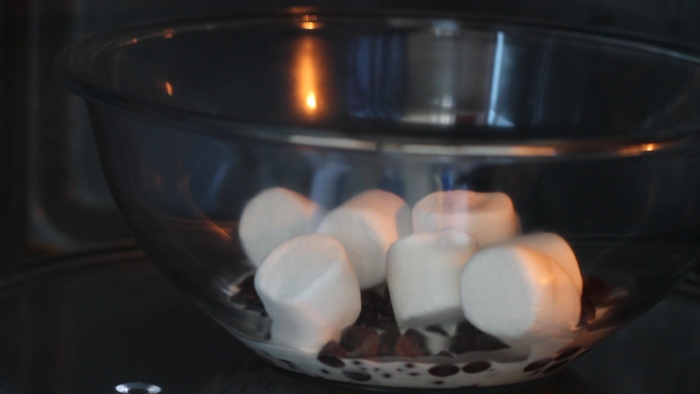 • 1. 처음으로, in a microwave safe bowl, 에 추가 3 1/2 oz of dark chocolate, ¼ cup of whipping cream, 과 8 big marshmallows. Microwave it for one minute. And stir a little to roughly combine. Then microwave for one more minute and stir until homogeneously mixed.