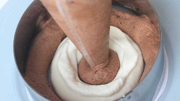 Pour the cocoa-milk mixture into the remaining 3 parts and delicately fold until mixed. Now transfer to a pastry bag.