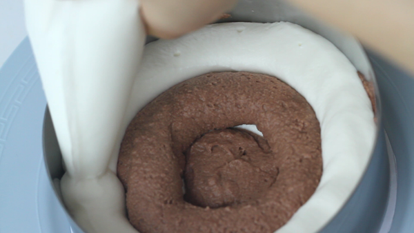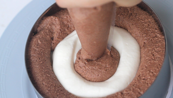 Then draw a middle circle with vanilla cream first. And draw outer circle and fill in the center with cocoa cream. The circle should be thick enough, so pipe with confidence. And flatten a little. This is the first layer.