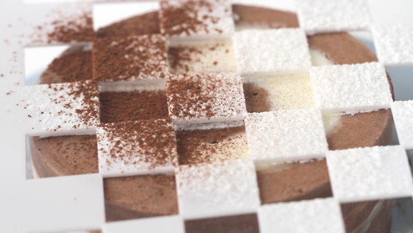 Now I will make a checker board pattern with a stencil. Today I am using confectioners’ sugar and unsweetened cocoa powder. And if you don’t have a stencil, you can make one with a paper.