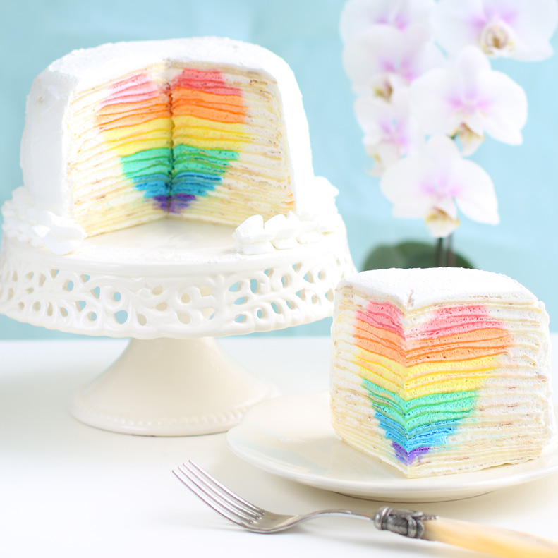 Recipe by Eugenie Kitchen at https://eugeniekitchen.com/mille-crepe-cake-with-hidden-rainbow-heart/