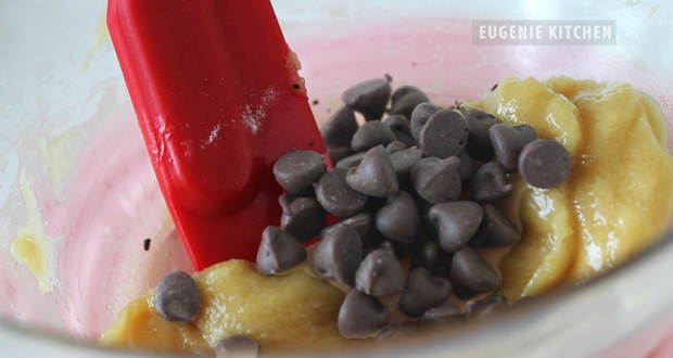 - Add all-purpose flour in (1) and fold until homogeneous. Finally fold in semi-sweet chocolate chips. Also dark or special dark chocolate chips are wonderful for this recipe.