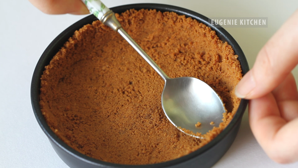 First, make crust. Put 2 oz of Graham crackers into a plastic bag and crush crackers with a rolling pin. Be sure to break them very finely. Instead of Graham, you can also use wafers, Digestive biscuits, etc. Transfer into a bowl and add in 2 tablespoons melted unsalted butter and stir until homogeneously mixed. And distribute among molds. Today I am using a mini tart pan and two silicon cupcakes. And press to make it firm. Then freeze.