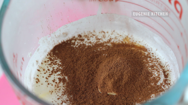 For filling, whip (half cup of) cream until peaks. Add in 2 tablespoons of granulated sugar and 1/2 teaspoon of pure vanilla extract. Then sift in 1 tablespoon of unsweetened cocoa powder. And stir until combined.