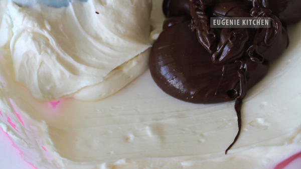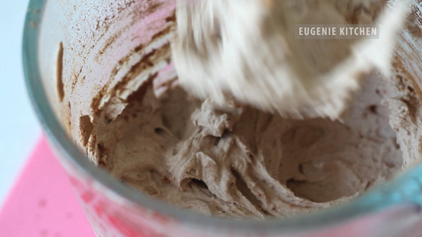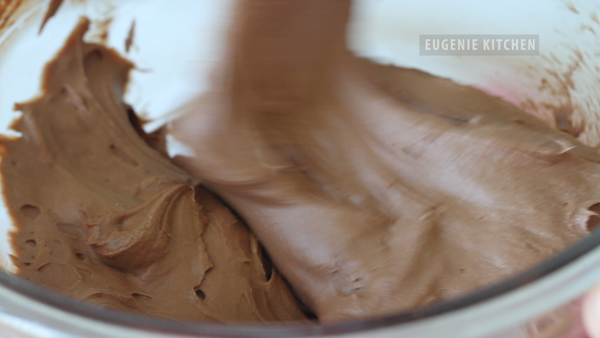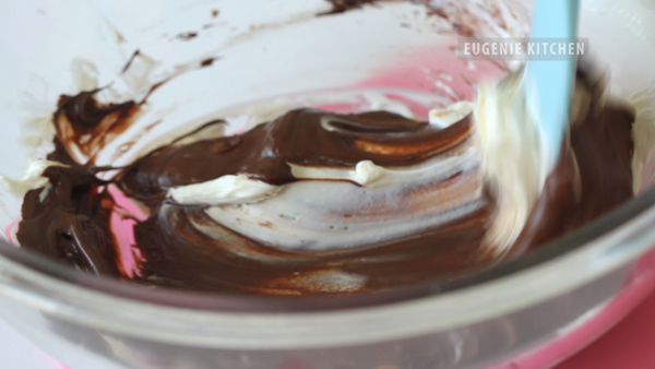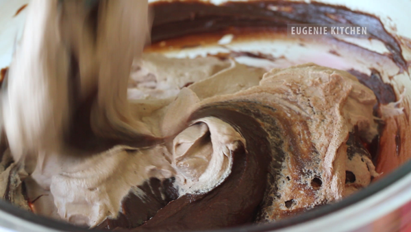 Then transfer whipped cream-cocoa mixture into chocolate-cheese mixture. And fold until homogeneously mixed.